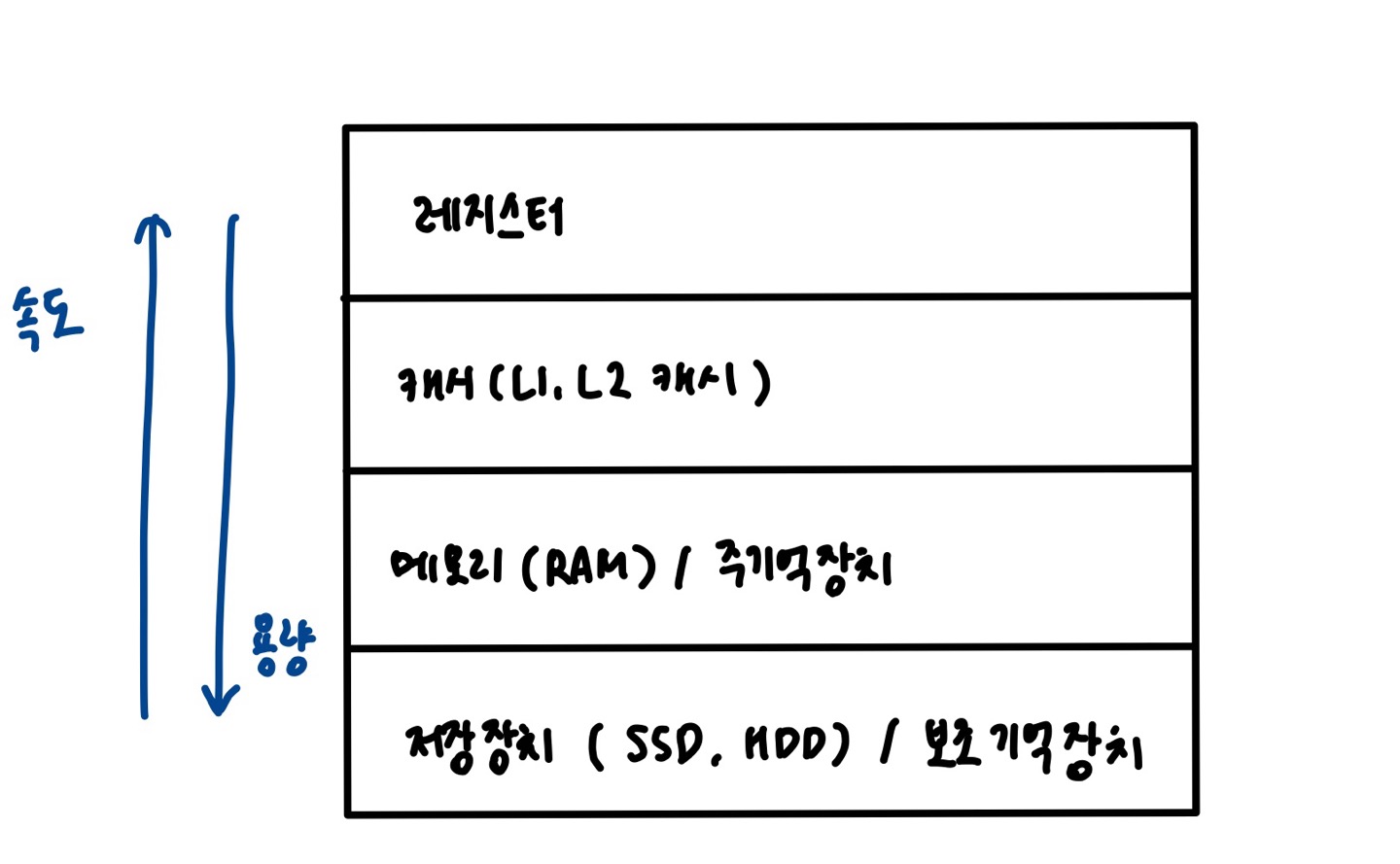 - 계층 위로 올라갈수록 비싸지지만 용량은 작아지고 속도는 빨라짐