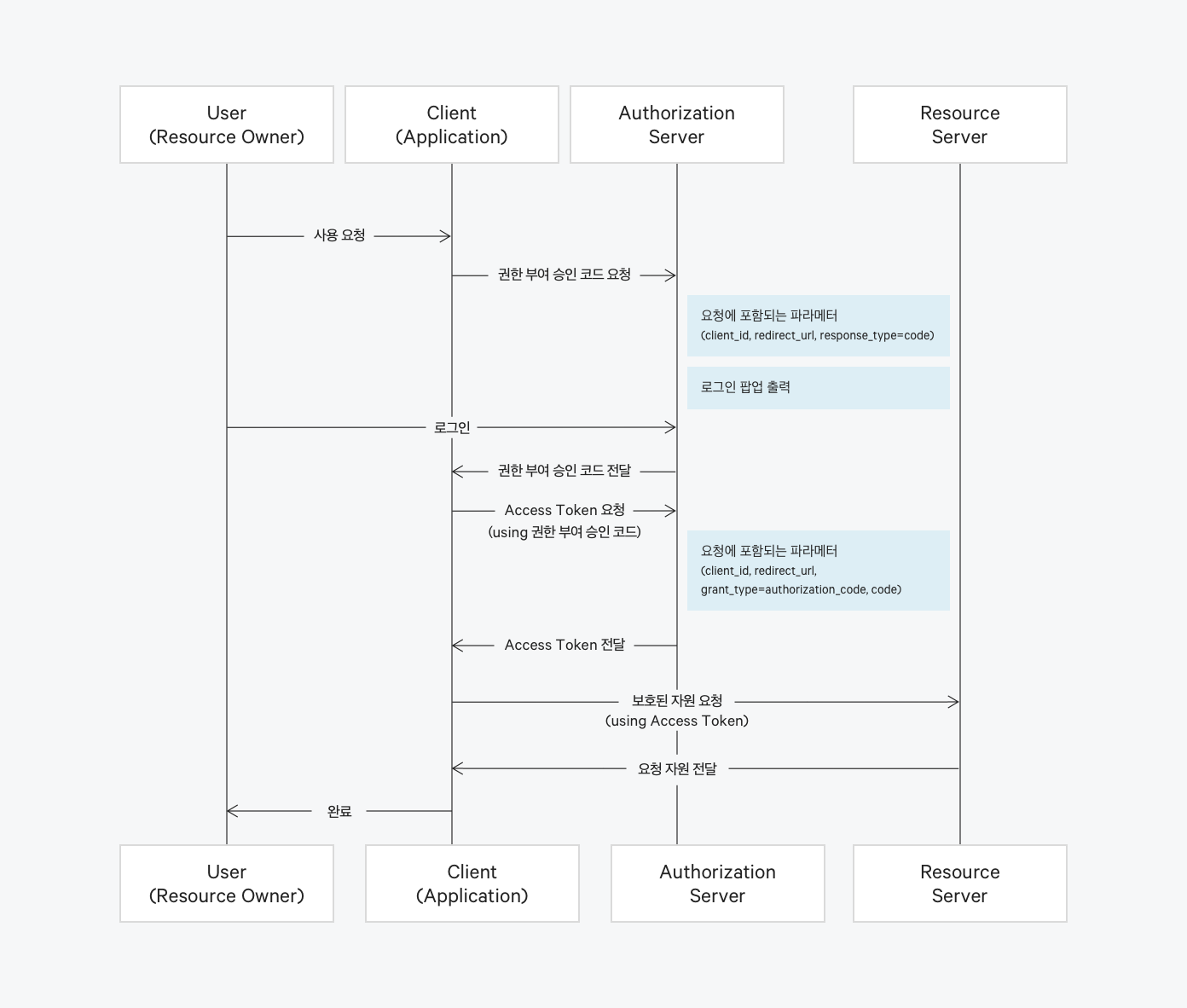 7) 서비스가 사용자에게 전달받은 authorization code를 사용해 authorization server에 인증 요청을 하면서 access token 발급 요청을 한다.