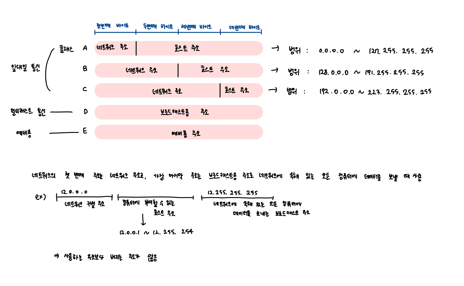 - 앞 부분에는 네트워크 주소, 그 뒤에 있는 부분은 컴퓨터에 부여하는 주소인 호스트 주소로 놓아서 사용